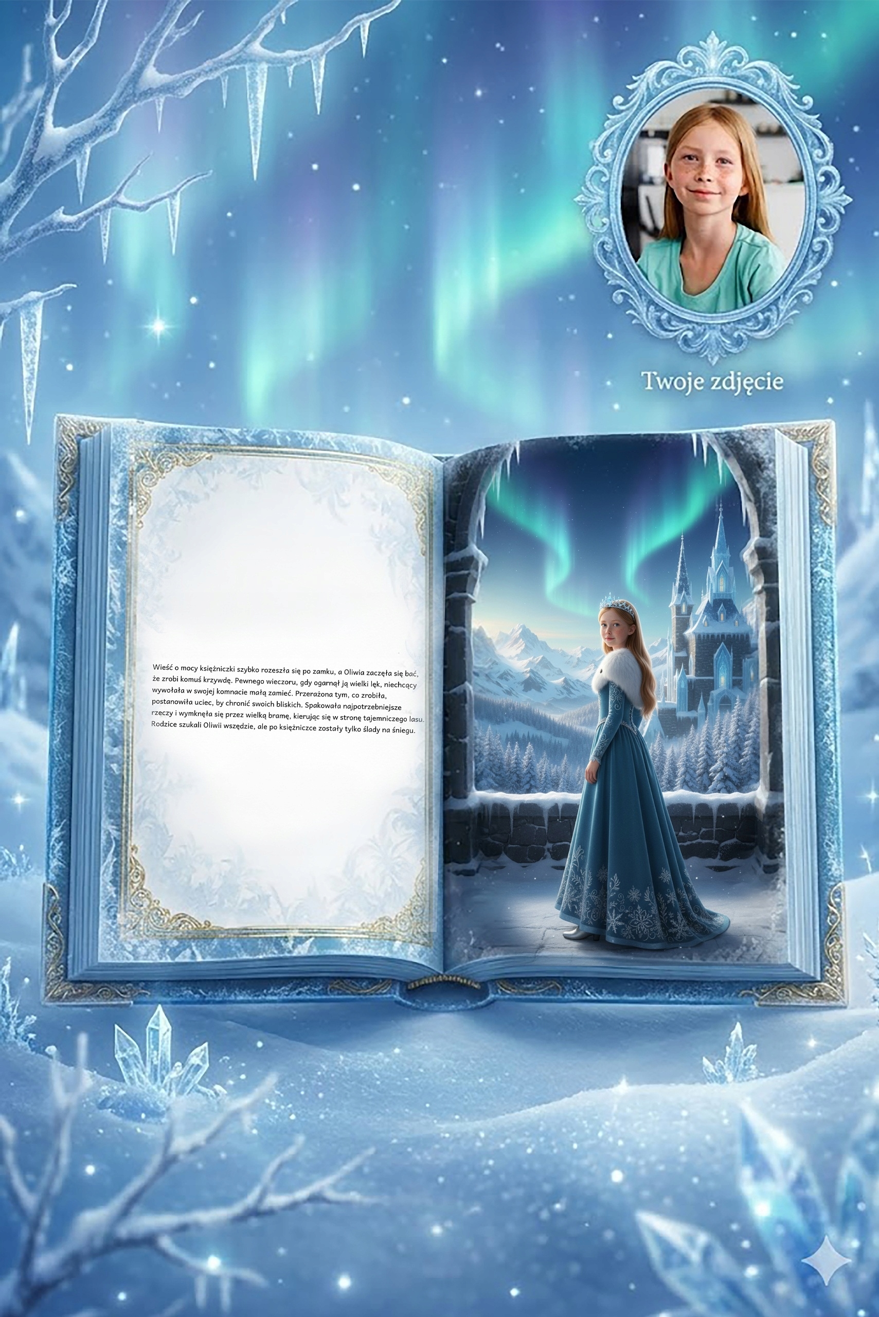 - Imię na okładce i w tekście: Tytuł książki oraz cała opowieść zostaną w pełni spersonalizowane (np. „Alicja i Królestwo Wiecznego Śniegu”). Imię pojawia się w kluczowych momentach – gdy bohaterka odkrywa lodowy tron, gdy spotyka magicznego, lśniącego lisa oraz gdy jej dobroć sprawia, że mroźne królestwo staje się najcieplejszym miejscem na świecie.