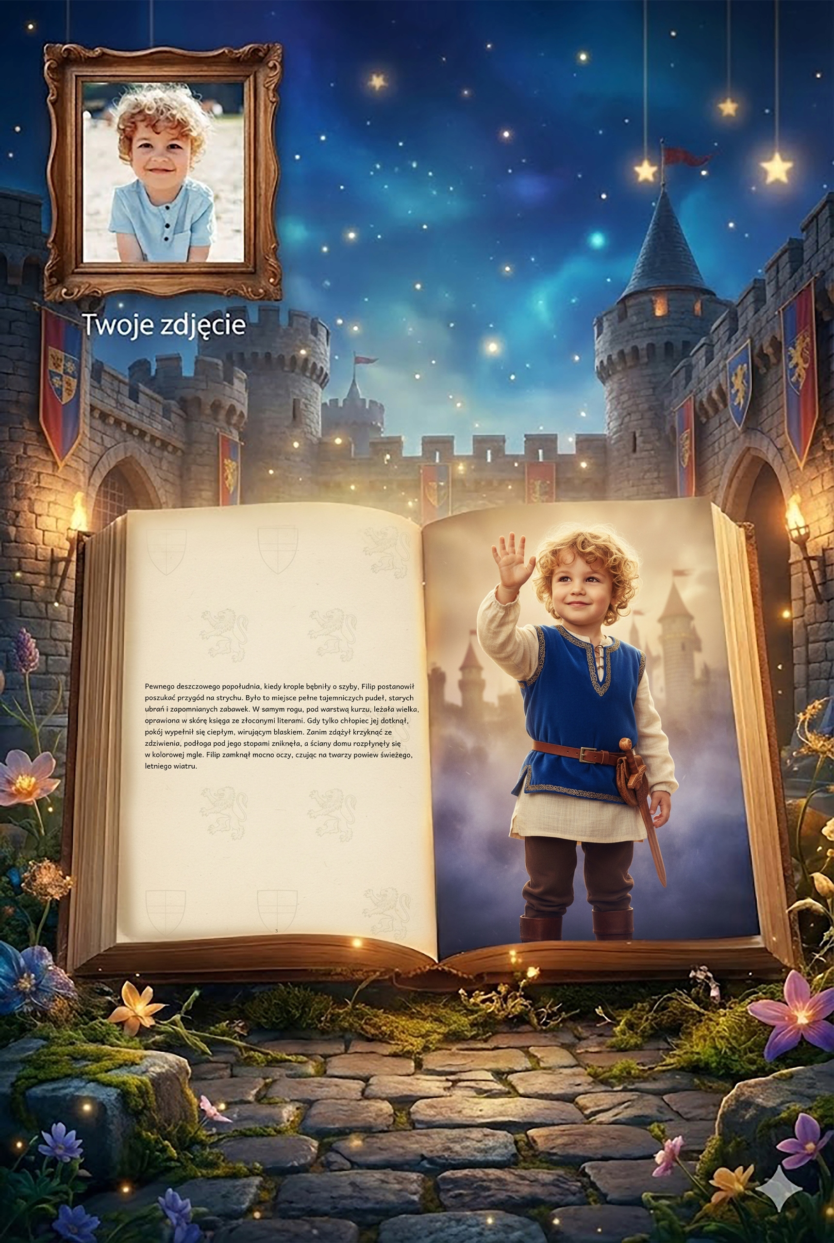 To nie jest zwykła bajka z wpisanym imieniem. To zaawansowana, fotorealistyczna personalizacja na poziomie kinowym, która przeniesie Twoje dziecko prosto do czasów zamków i rycerzy!