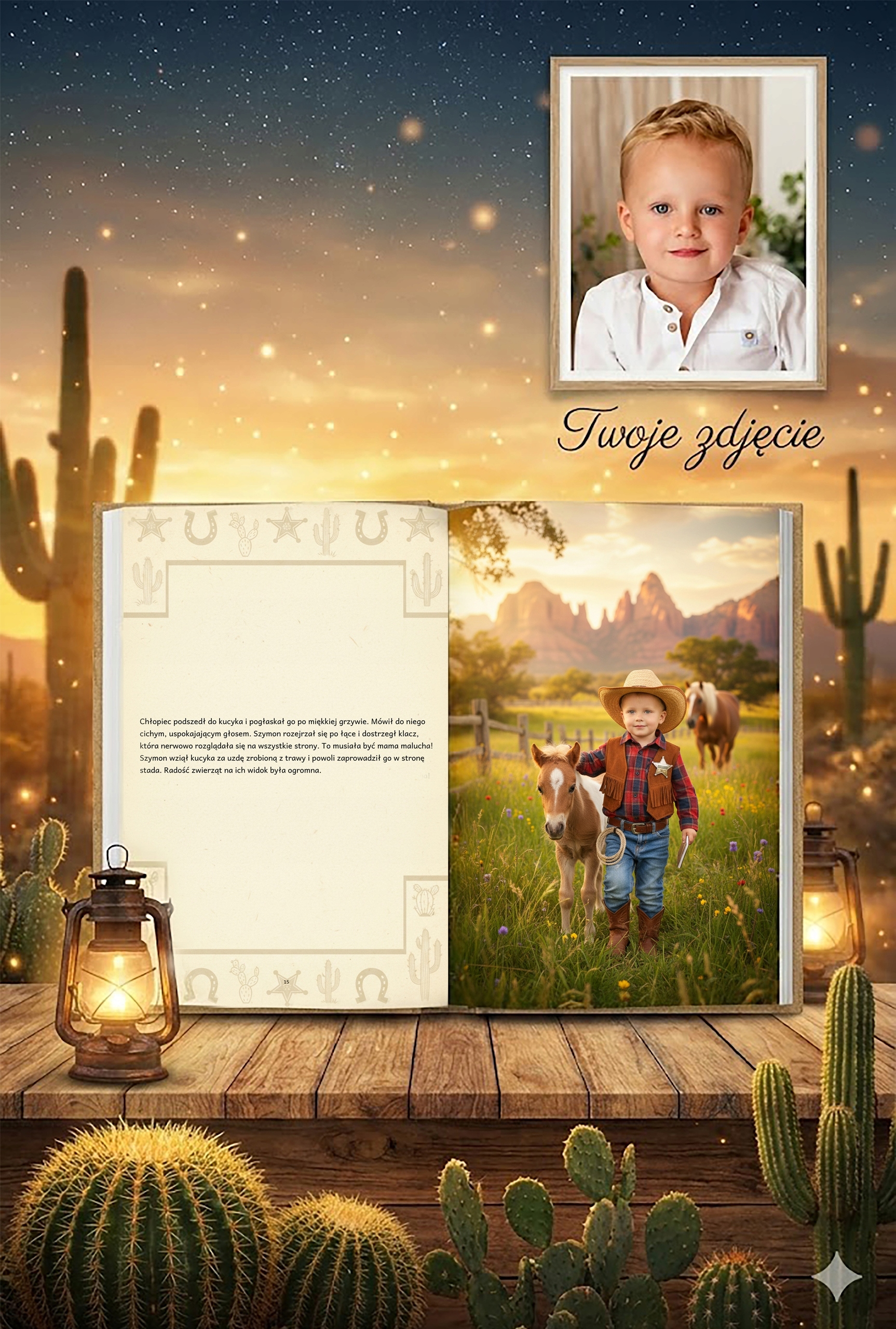 to niezwykła, personalizowana bajka, w której Twój syn staje się głównym bohaterem. Jego imię oraz twarz (wkomponowana w przepiękne, fotorealistyczne ilustracje skąpane w ciepłym, złotym słońcu prerii) towarzyszą mu w misji zaprowadzenia porządku w Słonecznym Jarze.