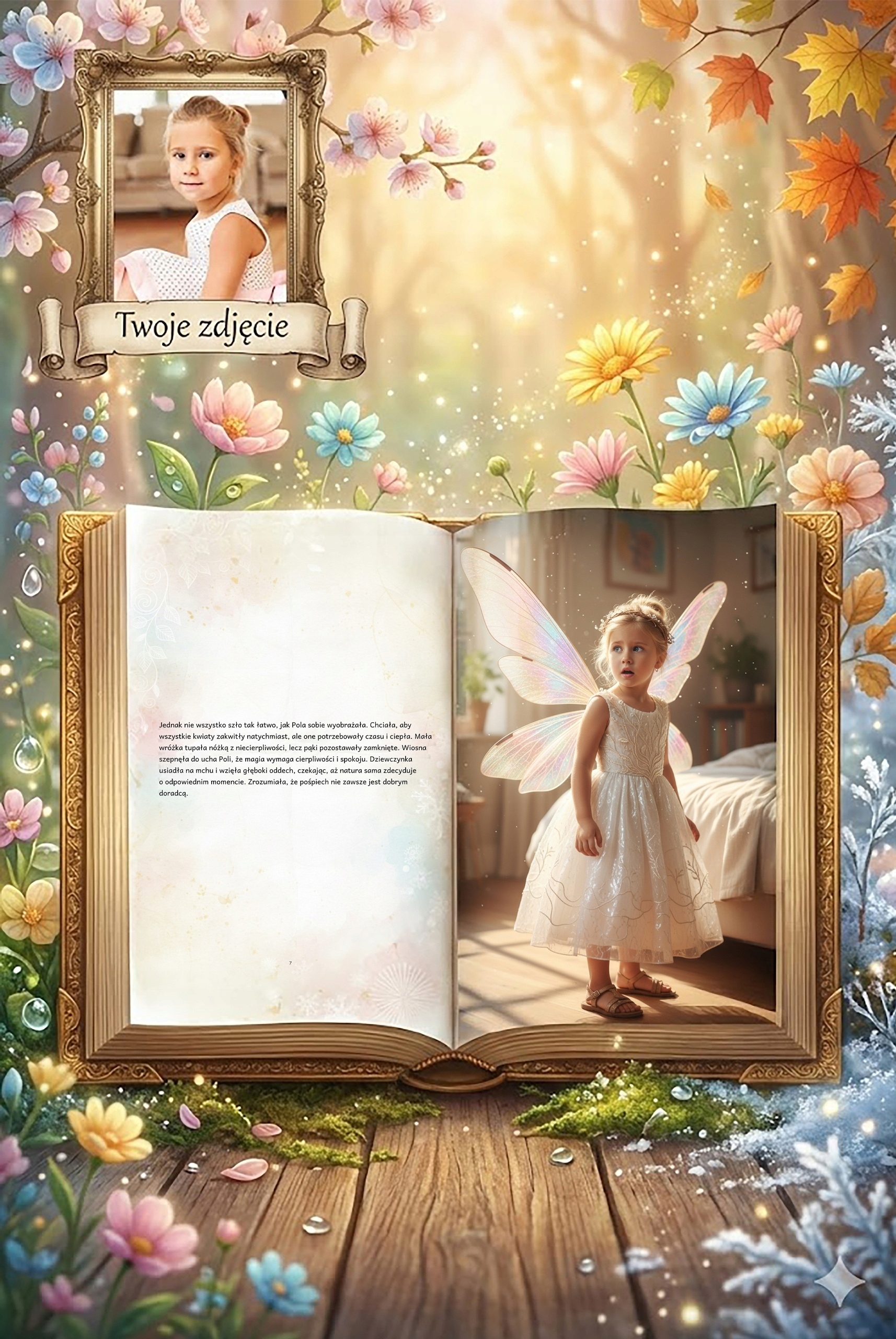 to niezwykła, personalizowana bajka, w której Twoja córeczka staje się główną bohaterką. Jej imię oraz twarz (wkomponowana w zapierające dech w piersiach, fotorealistyczne i baśniowe ilustracje) towarzyszą jej w niezwykłej podróży przez cały cykl natury.